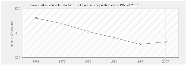 Cette courbe reprend l'historique de la population de Parlan de 1968 à 2007 en interpolation cubique. Ceci permet d'obtenir plus précisément la population de la commune de Parlan les années ou aucun recensement n'a été effectué.