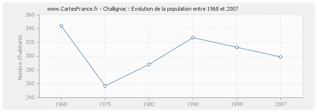 Cette courbe reprend l'historique de la population de Challignac de 1968 à 2007 en interpolation cubique. Ceci permet d'obtenir plus précisément la population de la commune de Challignac les années ou aucun recensement n'a été effectué.