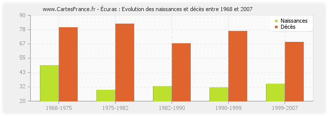 Écuras : évolution des naissances et décès de 1968 à 2007