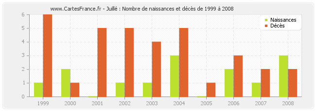 Juillé : évolution des naissances et décès de 1968 à 2007