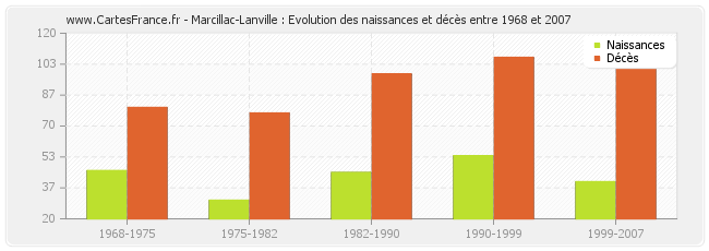 Marcillac-Lanville : évolution des naissances et décès de 1968 à 2007