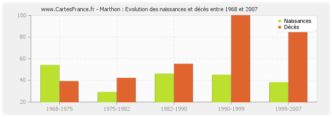 Marthon : évolution des naissances et décès de 1968 à 2007