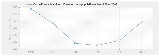 La population de Mons était de 259 habitants en 2007, 232 habitants en 1999, 225 habitants en 1990, 228 habitants en 1982, 257 habitants en 1975 et 278 habitants en 1968.