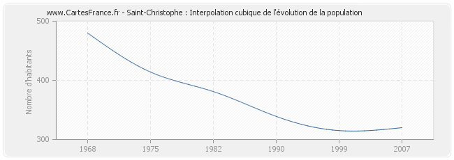 Cette courbe reprend l'historique de la population de Saint-Christophe de 1968 à 2007 en interpolation cubique. Ceci permet d'obtenir plus précisément la population de la commune de Saint-Christophe les années ou aucun recensement n'a été effectué.