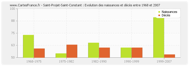 Saint-Projet-Saint-Constant : évolution des naissances et décès de 1968 à 2007