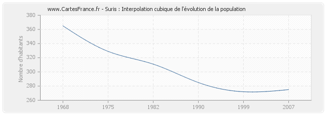 Cette courbe reprend l'historique de la population de Suris de 1968 à 2007 en interpolation cubique. Ceci permet d'obtenir plus précisément la population de la commune de Suris les années ou aucun recensement n'a été effectué.