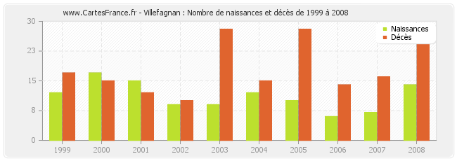 - Villefagnan en 2008 : 14 naissances et 26 décès