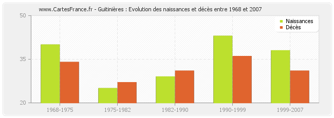Guitinières : évolution des naissances et décès de 1968 à 2007