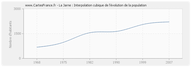 Cette courbe reprend l'historique de la population de La Jarne de 1968 à 2007 en interpolation cubique. Ceci permet d'obtenir plus précisément la population de la commune de La Jarne les années ou aucun recensement n'a été effectué.