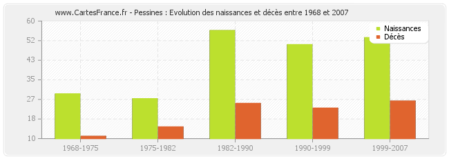 Pessines : évolution des naissances et décès de 1968 à 2007