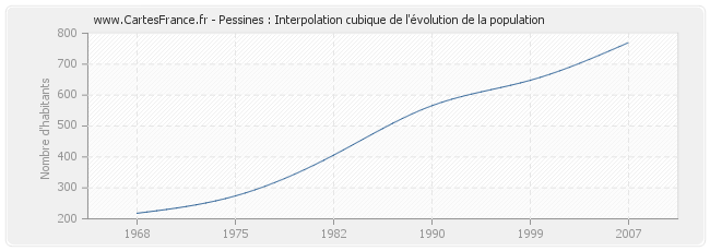 Cette courbe reprend l'historique de la population de Pessines de 1968 à 2007 en interpolation cubique. Ceci permet d'obtenir plus précisément la population de la commune de Pessines les années ou aucun recensement n'a été effectué.
