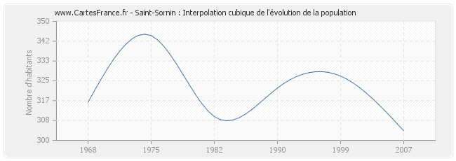 Cette courbe reprend l'historique de la population de Saint-Sornin de 1968 à 2007 en interpolation cubique. Ceci permet d'obtenir plus précisément la population de la commune de Saint-Sornin les années ou aucun recensement n'a été effectué.