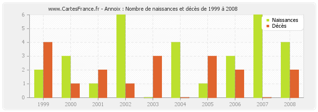 Annoix : évolution des naissances et décès de 1968 à 2007