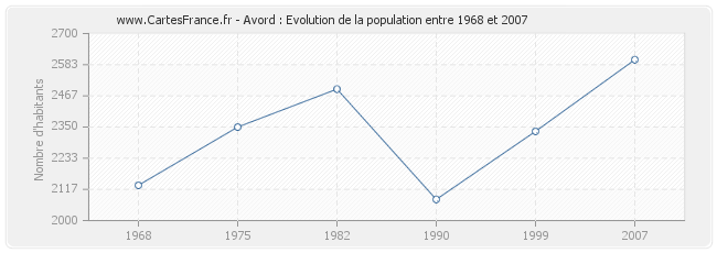 La population d'Avord était de 2 602 habitants en 2007, 2 334 habitants en 1999, 2 079 habitants en 1990, 2 492 habitants en 1982, 2 350 habitants en 1975 et 2 132 habitants en 1968.