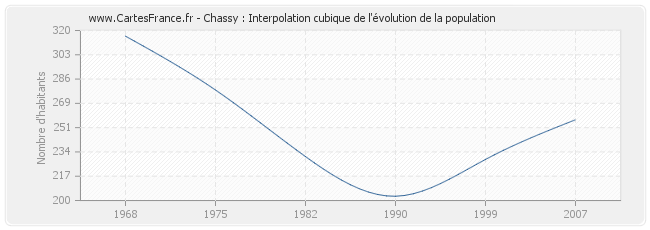 Cette courbe reprend l'historique de la population de Chassy de 1968 à 2007 en interpolation cubique. Ceci permet d'obtenir plus précisément la population de la commune de Chassy les années ou aucun recensement n'a été effectué.