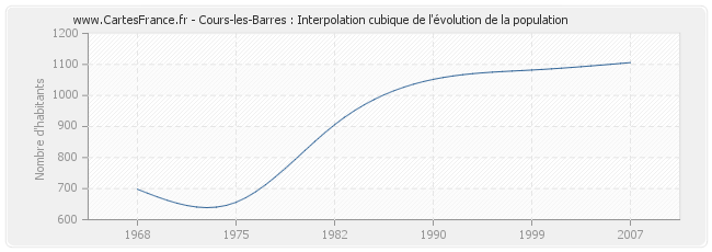 Cette courbe reprend l'historique de la population de Cours-les-Barres de 1968 à 2007 en interpolation cubique. Ceci permet d'obtenir plus précisément la population de la commune de Cours-les-Barres les années ou aucun recensement n'a été effectué.