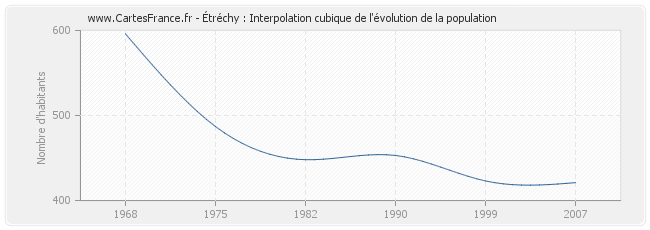 Cette courbe reprend l'historique de la population d'Étréchy de 1968 à 2007 en interpolation cubique. Ceci permet d'obtenir plus précisément la population de la commune d'Étréchy les années ou aucun recensement n'a été effectué.