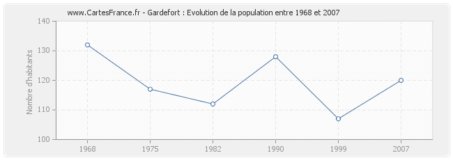 La population de Gardefort était de 120 habitants en 2007, 107 habitants en 1999, 128 habitants en 1990, 112 habitants en 1982, 117 habitants en 1975 et 132 habitants en 1968.
