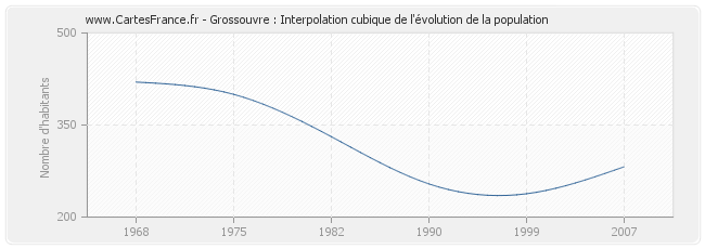 Cette courbe reprend l'historique de la population de Grossouvre de 1968 à 2007 en interpolation cubique. Ceci permet d'obtenir plus précisément la population de la commune de Grossouvre les années ou aucun recensement n'a été effectué.