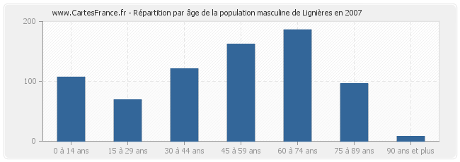 Répartition de la population masculine de Lignières par âge en 2007 :