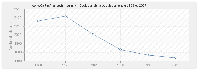La population de Lunery était de 1 477 habitants en 2007, 1 536 habitants en 1999, 1 665 habitants en 1990, 2 021 habitants en 1982, 2 440 habitants en 1975 et 2 329 habitants en 1968.