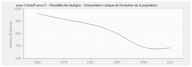 Cette courbe reprend l'historique de la population de Marseilles-lès-Aubigny de 1968 à 2007 en interpolation cubique. Ceci permet d'obtenir plus précisément la population de la commune de Marseilles-lès-Aubigny les années ou aucun recensement n'a été effectué.