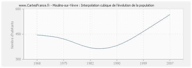 Cette courbe reprend l'historique de la population de Moulins-sur-Yèvre de 1968 à 2007 en interpolation cubique. Ceci permet d'obtenir plus précisément la population de la commune de Moulins-sur-Yèvre les années ou aucun recensement n'a été effectué.