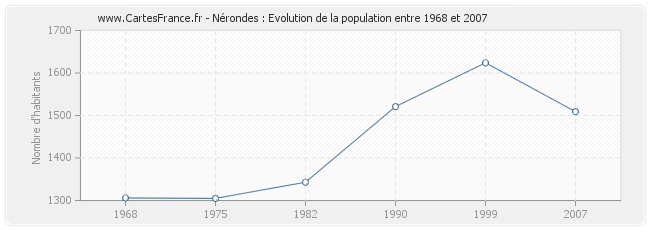 Cette courbe reprend l'historique de la population de Nérondes de 1968 à 2007 en interpolation cubique. Ceci permet d'obtenir plus précisément la population de la commune de Nérondes les années ou aucun recensement n'a été effectué.