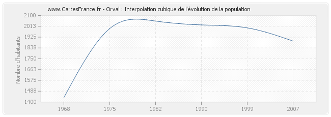 Cette courbe reprend l'historique de la population d'Orval de 1968 à 2007 en interpolation cubique. Ceci permet d'obtenir plus précisément la population de la commune d'Orval les années ou aucun recensement n'a été effectué.