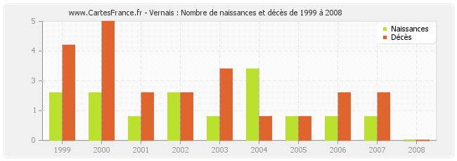 Vernais : évolution des naissances et décès de 1968 à 2007