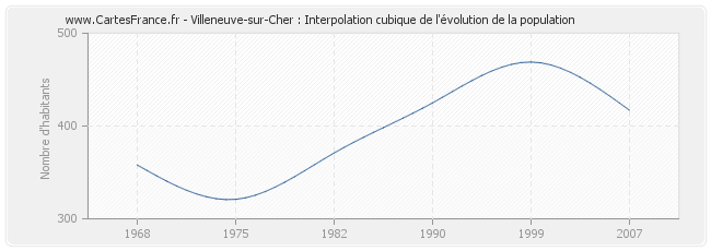 Cette courbe reprend l'historique de la population de Villeneuve-sur-Cher de 1968 à 2007 en interpolation cubique. Ceci permet d'obtenir plus précisément la population de la commune de Villeneuve-sur-Cher les années ou aucun recensement n'a été effectué.