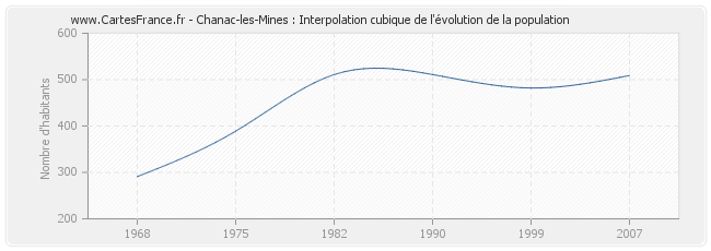 Cette courbe reprend l'historique de la population de Chanac-les-Mines de 1968 à 2007 en interpolation cubique. Ceci permet d'obtenir plus précisément la population de la commune de Chanac-les-Mines les années ou aucun recensement n'a été effectué.