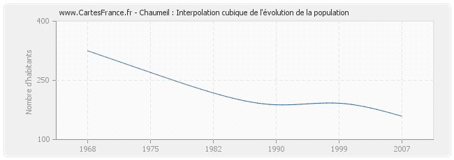 Cette courbe reprend l'historique de la population de Chaumeil de 1968 à 2007 en interpolation cubique. Ceci permet d'obtenir plus précisément la population de la commune de Chaumeil les années ou aucun recensement n'a été effectué.