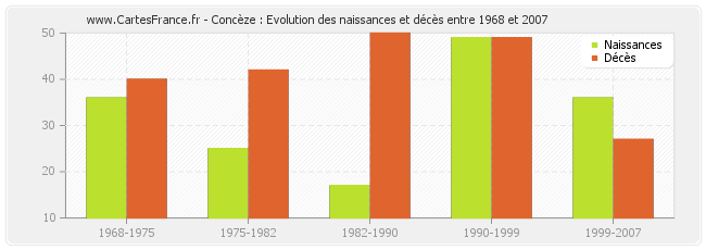 Concèze : évolution des naissances et décès de 1968 à 2007