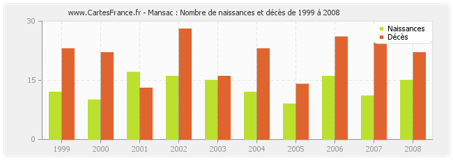 - Mansac en 2008 : 15 naissances et 22 décès