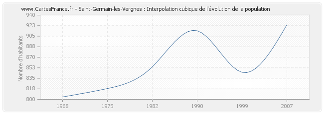 Cette courbe reprend l'historique de la population de Saint-Germain-les-Vergnes de 1968 à 2007 en interpolation cubique. Ceci permet d'obtenir plus précisément la population de la commune de Saint-Germain-les-Vergnes les années ou aucun recensement n'a été effectué.