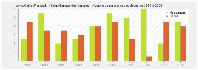 - Saint-Germain-les-Vergnes en 2008 : 11 naissances et 10 décès