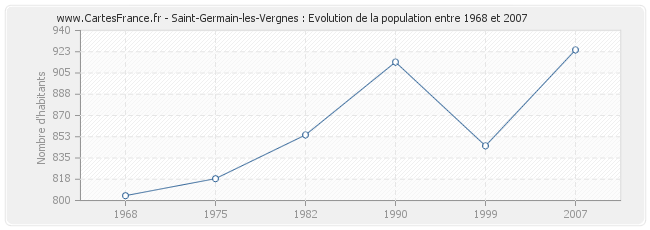 La population de Saint-Germain-les-Vergnes était de 924 habitants en 2007, 845 habitants en 1999, 914 habitants en 1990, 854 habitants en 1982, 818 habitants en 1975 et 804 habitants en 1968.