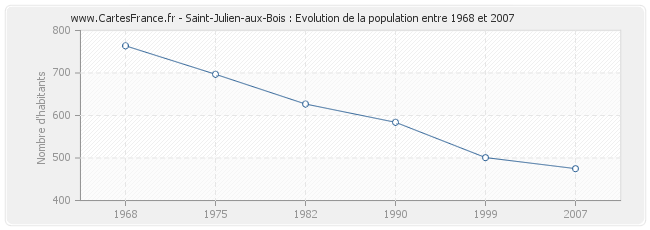 La population de Saint-Julien-aux-Bois était de 475 habitants en 2007, 501 habitants en 1999, 584 habitants en 1990, 627 habitants en 1982, 697 habitants en 1975 et 764 habitants en 1968.