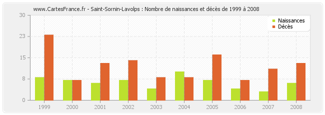 - Saint-Sornin-Lavolps en 2008 : 6 naissances et 13 décès