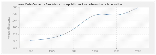 Cette courbe reprend l'historique de la population de Saint-Viance de 1968 à 2007 en interpolation cubique. Ceci permet d'obtenir plus précisément la population de la commune de Saint-Viance les années ou aucun recensement n'a été effectué.