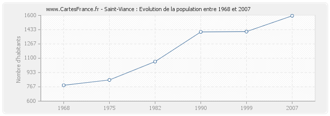 La population de Saint-Viance était de 1 595 habitants en 2007, 1 411 habitants en 1999, 1 407 habitants en 1990, 1 061 habitants en 1982, 847 habitants en 1975 et 785 habitants en 1968.
