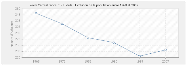 La population de Tudeils était de 242 habitants en 2007, 224 habitants en 1999, 263 habitants en 1990, 277 habitants en 1982, 317 habitants en 1975 et 347 habitants en 1968.