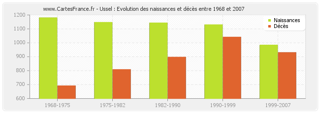 Ussel : évolution des naissances et décès de 1968 à 2007