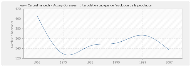 Cette courbe reprend l'historique de la population d'Auxey-Duresses de 1968 à 2007 en interpolation cubique. Ceci permet d'obtenir plus précisément la population de la commune d'Auxey-Duresses les années ou aucun recensement n'a été effectué.