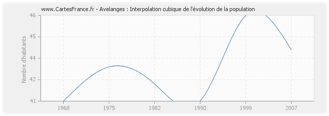 Cette courbe reprend l'historique de la population d'Avelanges de 1968 à 2007 en interpolation cubique. Ceci permet d'obtenir plus précisément la population de la commune d'Avelanges les années ou aucun recensement n'a été effectué.