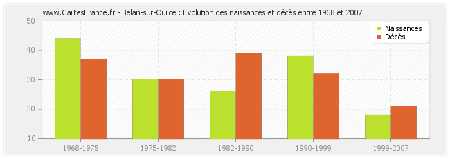 Belan-sur-Ource : évolution des naissances et décès de 1968 à 2007