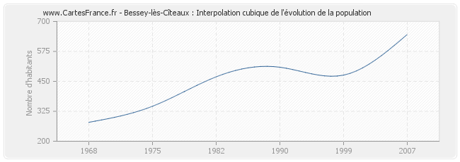 Cette courbe reprend l'historique de la population de Bessey-lès-Cîteaux de 1968 à 2007 en interpolation cubique. Ceci permet d'obtenir plus précisément la population de la commune de Bessey-lès-Cîteaux les années ou aucun recensement n'a été effectué.