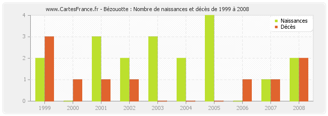 - Bézouotte en 2005 : 4 naissances et 0 décès