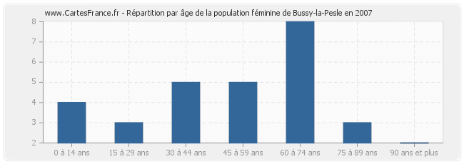- Femmes de 60 à 74 ans habitant Bussy-la-Pesle : 8